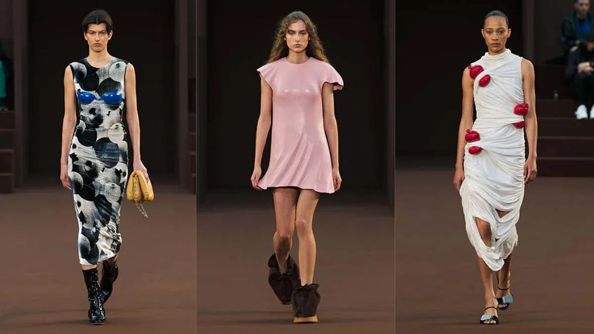 开场几件连衣裙注入精妙雕塑感——以高超手法诠释皮革(品牌毕竟以皮革品起家),让连衣裙在没有狂风“侵袭”的室内也看似被风吹皱般,非常精彩!