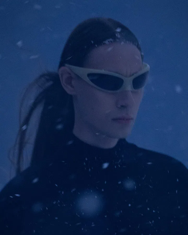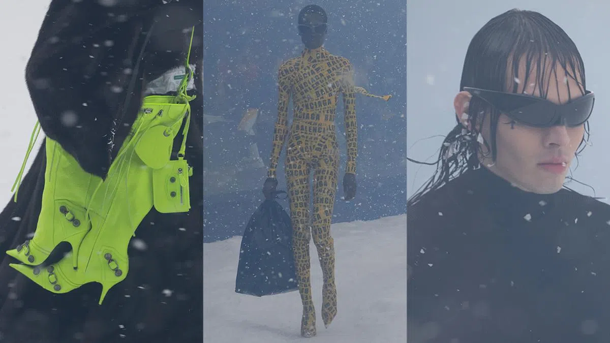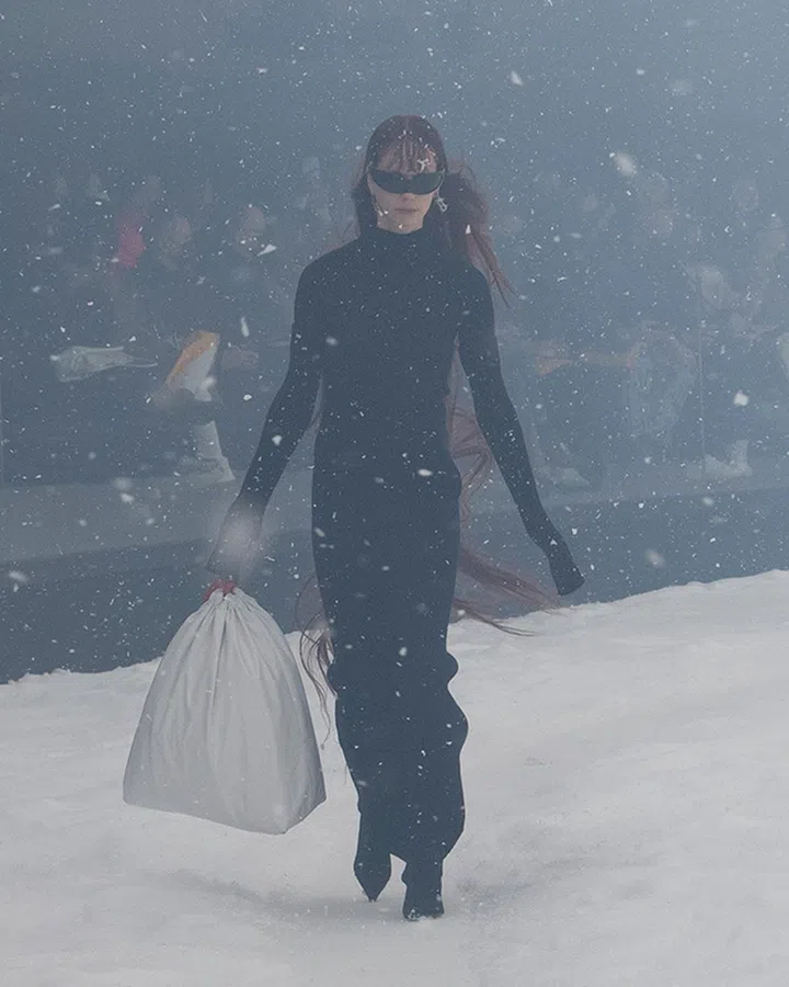 秀场被设置在白雪遍地的暴风雪景中,隔着玻璃防护屏观看的观众,仿佛看到了一望无际,却颇为陌生的场景。这场秀原以现今气候的极端变化为出发点,但在时势战争的造就下,走在秀场的模特儿都宛如坚强的勇士般,孤立地走在暴风雪中,无所畏惧地迈向未知的未来。严肃的场景下,Demna透过模特儿身上的服饰给予他们力量,向世界宣告着宁死不屈的人性最高情操。