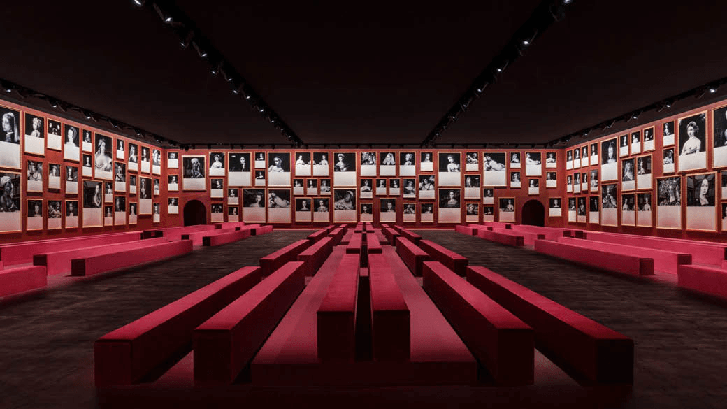 Maria Grazia Chiuri自上任以来,每季都会请来女性艺术家合作参与秀场设计,这季也不例外。本季秀场由意大利艺术家Mariella Bettineschi操刀,并命名为《The Next Era》。秀场设计概念犹如走进艺术画廊一般,16世纪至19世纪的古典女性肖像(其中包括名画如《带珍珠耳环的少女》、《蒙娜丽莎》、《宫女》等)被Mariella抽离自身时代,将画中人物带入现代,赋予“第二双眼睛”,注视并质疑着对女性的约束,同时审视着秀场上的动态,华丽而非常有张力。