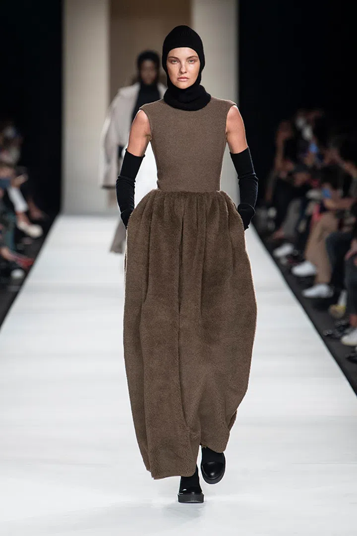 品牌的Teddy Bear面料我们已经很熟悉它出现在大衣或者手袋上了吧?这次,Max Mara就试着refresh你的印象,将它应用在长衫、长裙甚至短裤上,并在廓形上展现显著的对比感(迷你与超大,微小与宏大,紧身和宽阔),令造型既优雅又可爱。