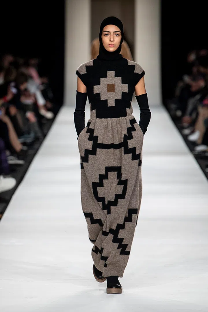 Max Mara创意总监Ian Griffiths将Sophie Taeuber-Arp的代表作,为18世纪喜剧《鹿王》(King Stag)设计的木偶作为灵感,创作了不少有趣造型。以球状/钟形裙装结合修身上衣,配搭袖套及Balaclava帽/头套,廓形令人过目不忘。