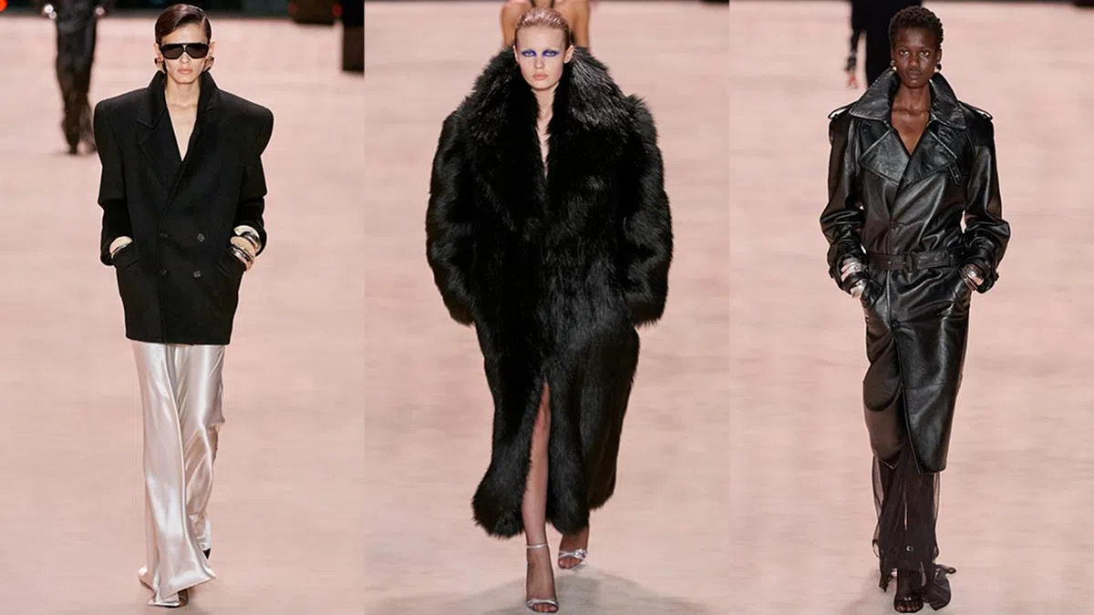 自2021年9月起,品牌母公司Kering集团就已宣布完全弃用皮草(而皮草时装向来是Saint Laurent历史中的重要组成部分)。但人造皮草真的不能展现出奢华感吗?看看Anthony Vaccarello所带来的人造皮草时装,材质柔软又有光泽,无疑使用最上等的材料,从而成功打造复古又华贵的皮草造型。