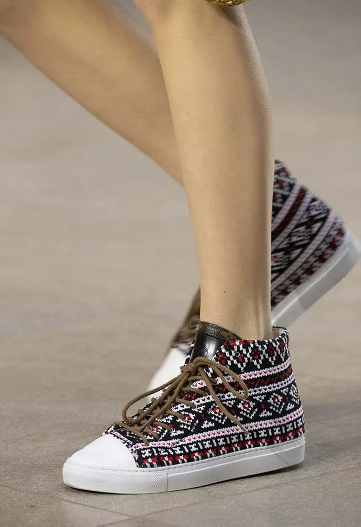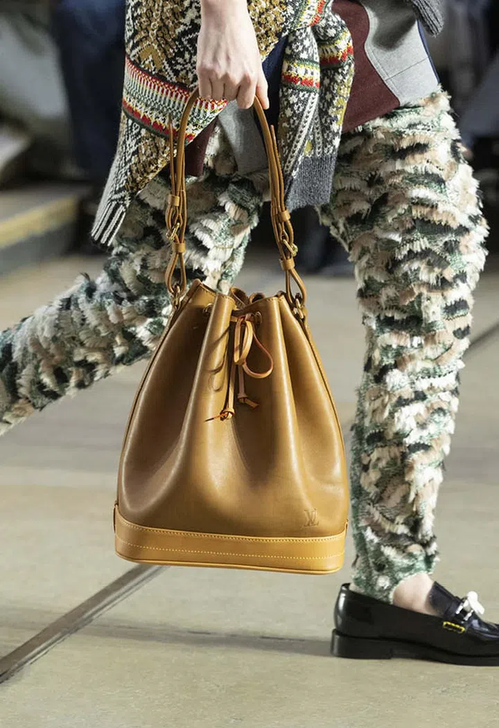 配件方面:灵感取自“阿嫲棉被袋”的花卉提袋虽已被Balenciaga的Demna Gvasalia诠释过,但较小的尺寸似乎更契合时代美感;经典“香槟袋”Noe重新被演绎,这次以单色系(土色)取代原有Monogram花纹;灵感取自乐福鞋的平底皮鞋被露了趾,算是被注入了一点新意;球鞋披上民族风图案,颇具一丝浪漫情怀。