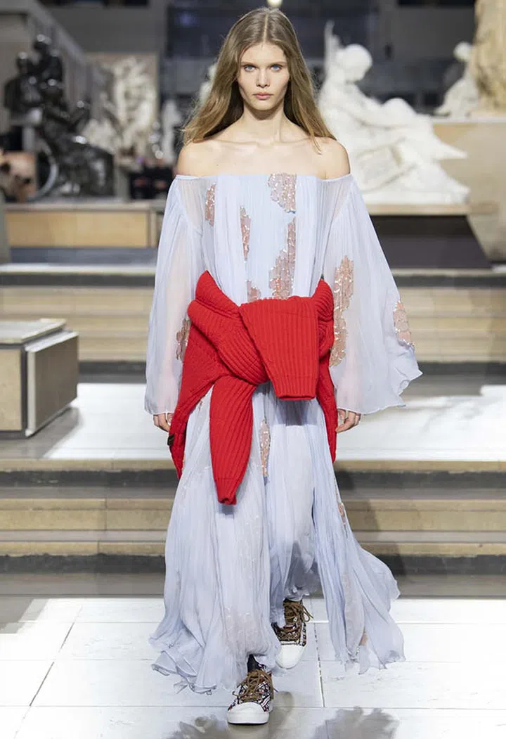 飘逸露肩连衣裙搭配休闲鞋,已远比配高跟鞋有意思;再仿效1990年代学院风于腰部系上毛衣,整体造型很具冲突美感!