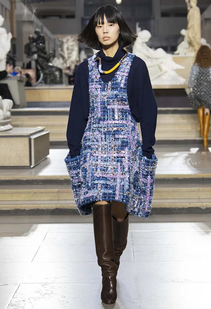以为时装廓形已变不出花样?Nicolas Ghesquière设计出独特“凸”形花呢连衣裙,搭配宽松毛衣及长靴,整体造型好突出!