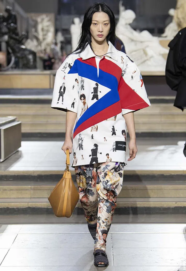 1990年代青年衣柜不可缺的polo衫,来到Nicolas Ghesquière手里当让不能一般。同样印上David Sims的人物肖像,整体廓形更硬挺、夸大;搭配花卉长裤,造型超爆!