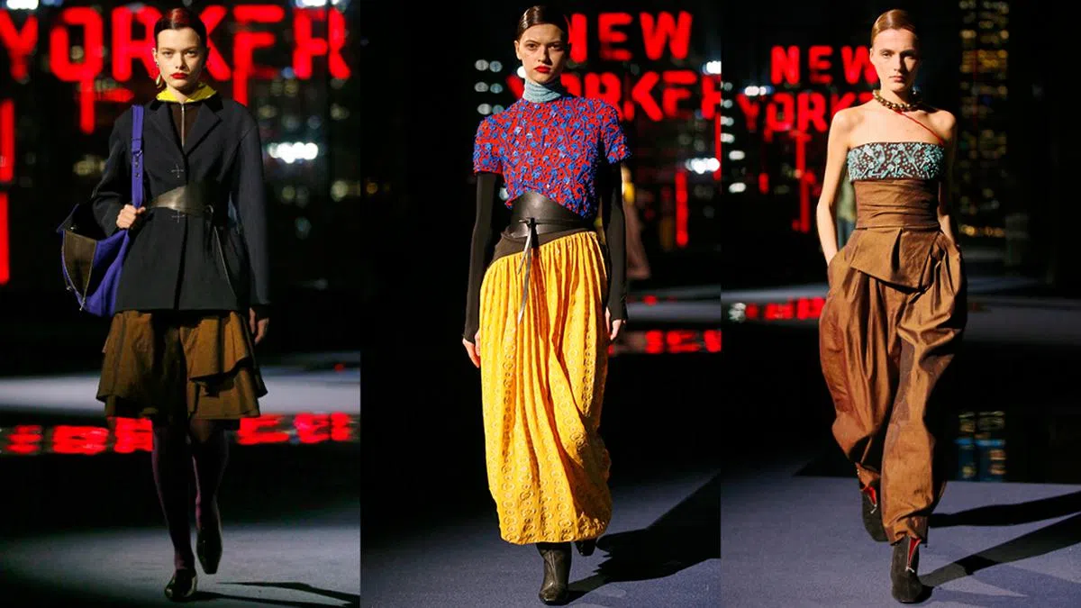 今季秀场上,模特身上的穿搭充满了鲜明的对比元素。立体丰盈的廓形与紧贴的层次营造突兀之美、鲜明的撞色系几何图形设计划过柔美的身体曲线、透视针织面料单披肩、柔顺奢华与硬朗的羊毛西装布料成正比,借由轮廓、拼接、色彩以及布料材质大完混搭,展现纽约不受限的文化“大熔炉”。