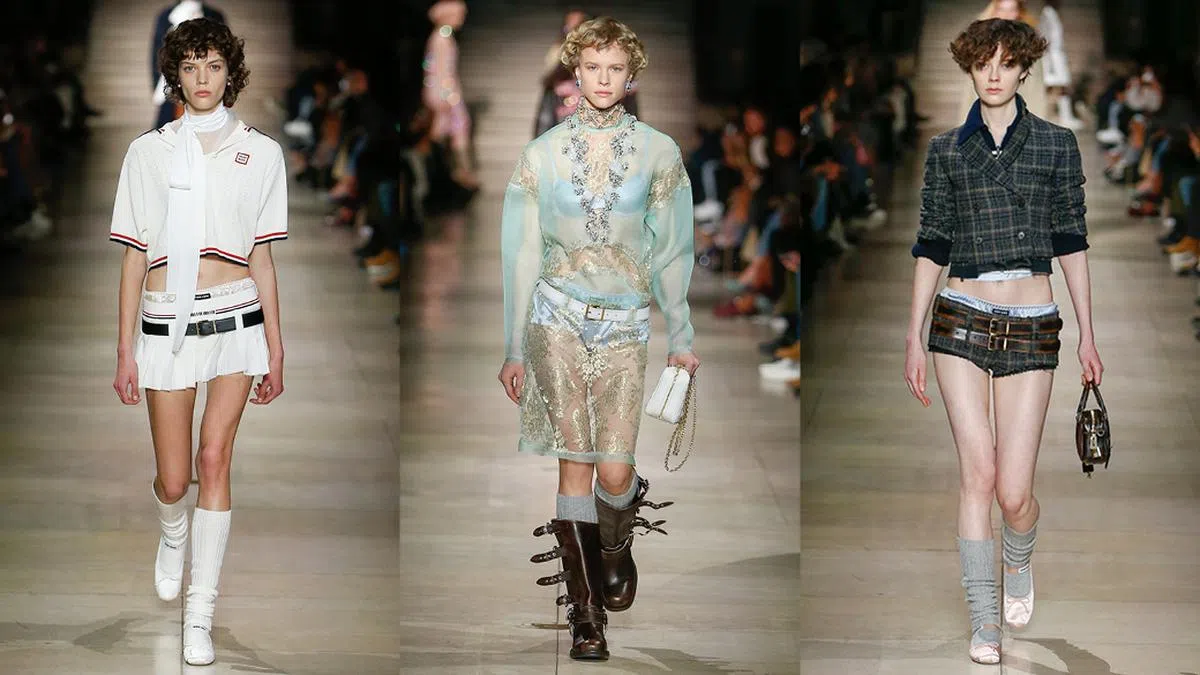 新一季,设计师Miuccia Prada把Miu Miu女孩的叛逆态度带到网球场上。超低腰迷你裙,短版上衣,露出内裤,再加上芭蕾风十足的鞋袜和出其不意的领巾,令造型独特且极具品牌辨识度。
