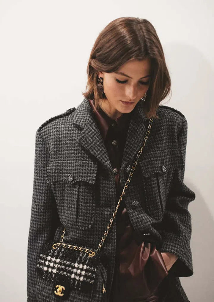 用花呢材质制作手袋,对品牌而言当然不是new news。这次以两种不同“格局”的花呢打造flap链袋,重点是(其一)花呢和外套花呢纹样一模一样,造型更具一体时尚感。