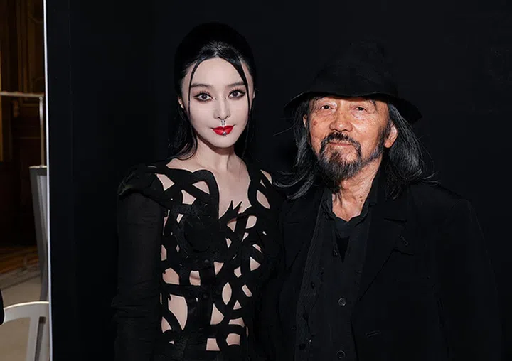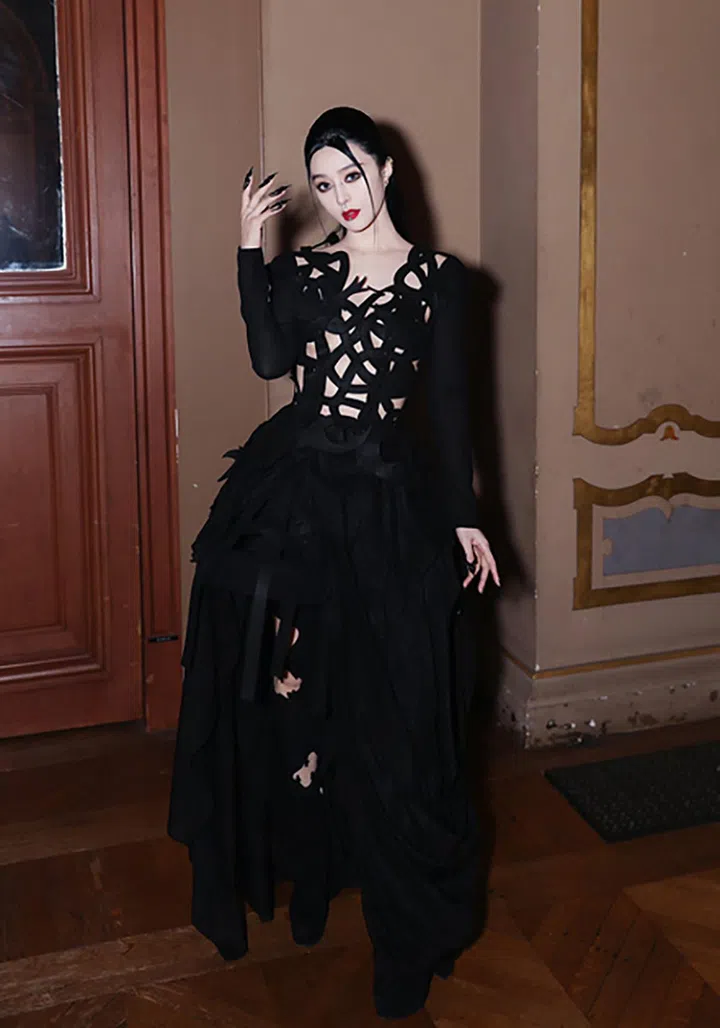 范冰冰与山本耀司先生合影,身上的这套剪纸风格黑色镂空服饰来自Yohji Yamamoto 2023春夏系列。她大胆尝试暗黑风格,造型魅惑又神秘,让人看见她不同的一面。