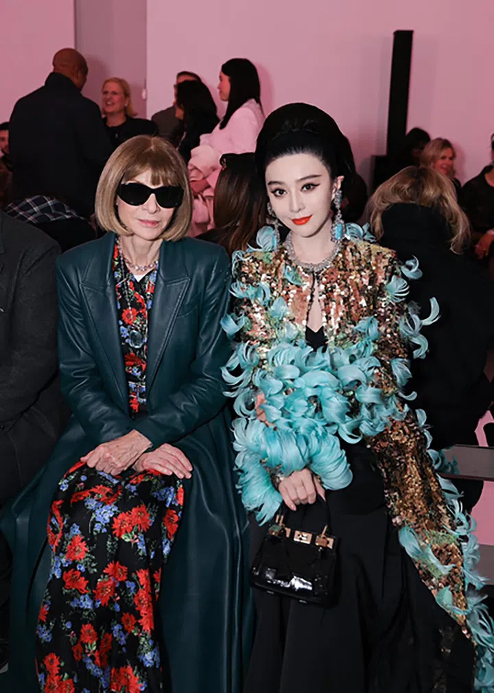 范冰冰与美国Vogue主编Anna Wintour合影,大气明艳,怡然优雅,而且可谓把时装秀观秀造型也提升到MET Gala的高度。
