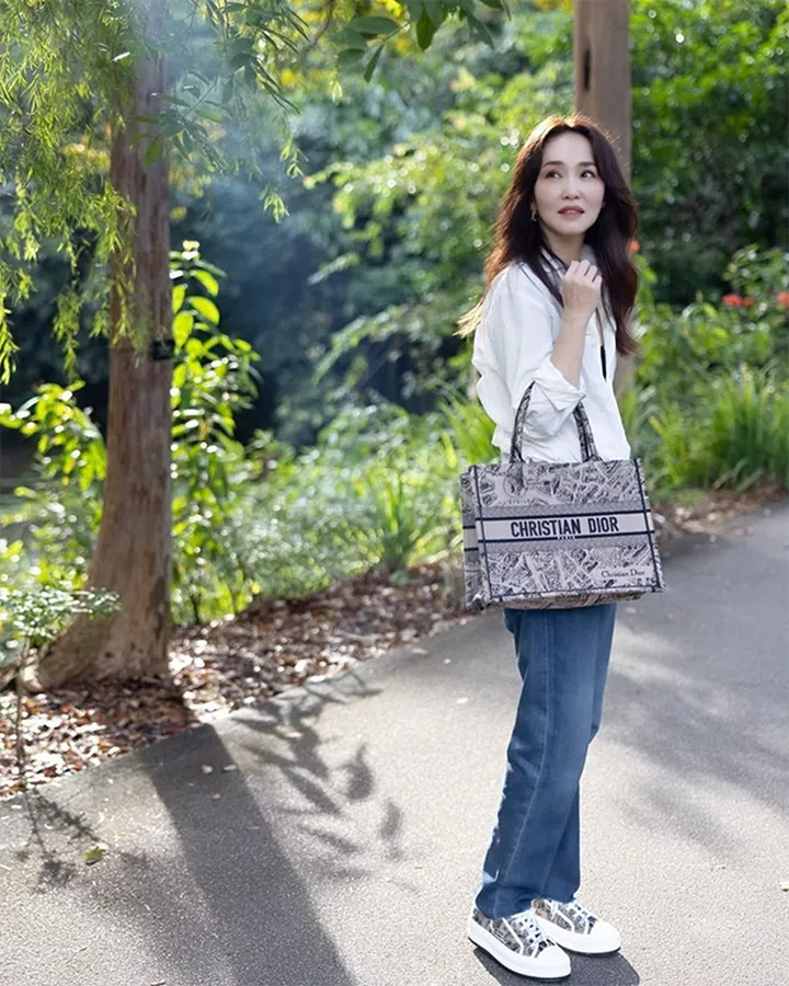 范文芳手上拎着的Dior Book Tote,是出自品牌2023年春夏的新款式。仔细看托特包上的花纹,创意总监Maria Grazia Chiuri可是将巴黎的地图融入其中,里面还能看到品牌在30 Avenue Montaigne的经典地标。