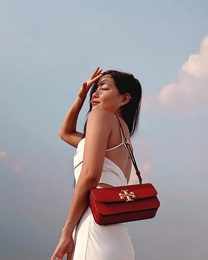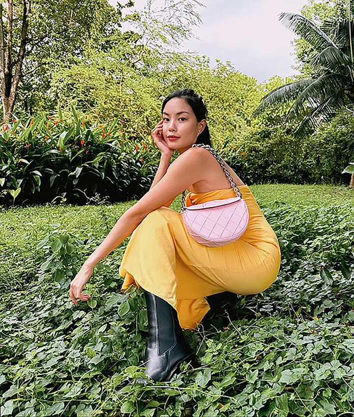 颜色是最直观给人心理感受的元素,这意味者,色彩可以直接触发人们的情感和心理反应。芳榕上图穿着的黄色,就是令人愉悦的色彩之一,外加来自Tory Burch的Mini Fleming粉色月牙包,整体给人一种欢欣、轻松的气息。