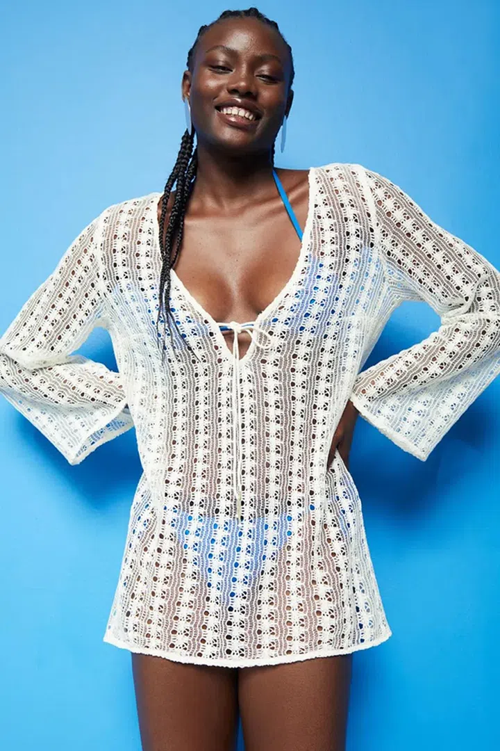 度假讲求的是舒服、舒服、舒服。重要的事情要讲三遍。不妨尝试在文胸外罩上这款深V钩针编织罩衫,为度假穿搭注入浪漫的柔美情节。