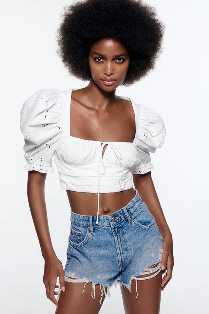 白色短版上衣搭配蓬蓬袖和刺绣等浪漫细节,无疑是展露随意和不羁的百搭单品。建议与色彩鲜艳的半身长裙穿搭,以繁杂感设计呼应短版上衣的细节,展现时尚态度。