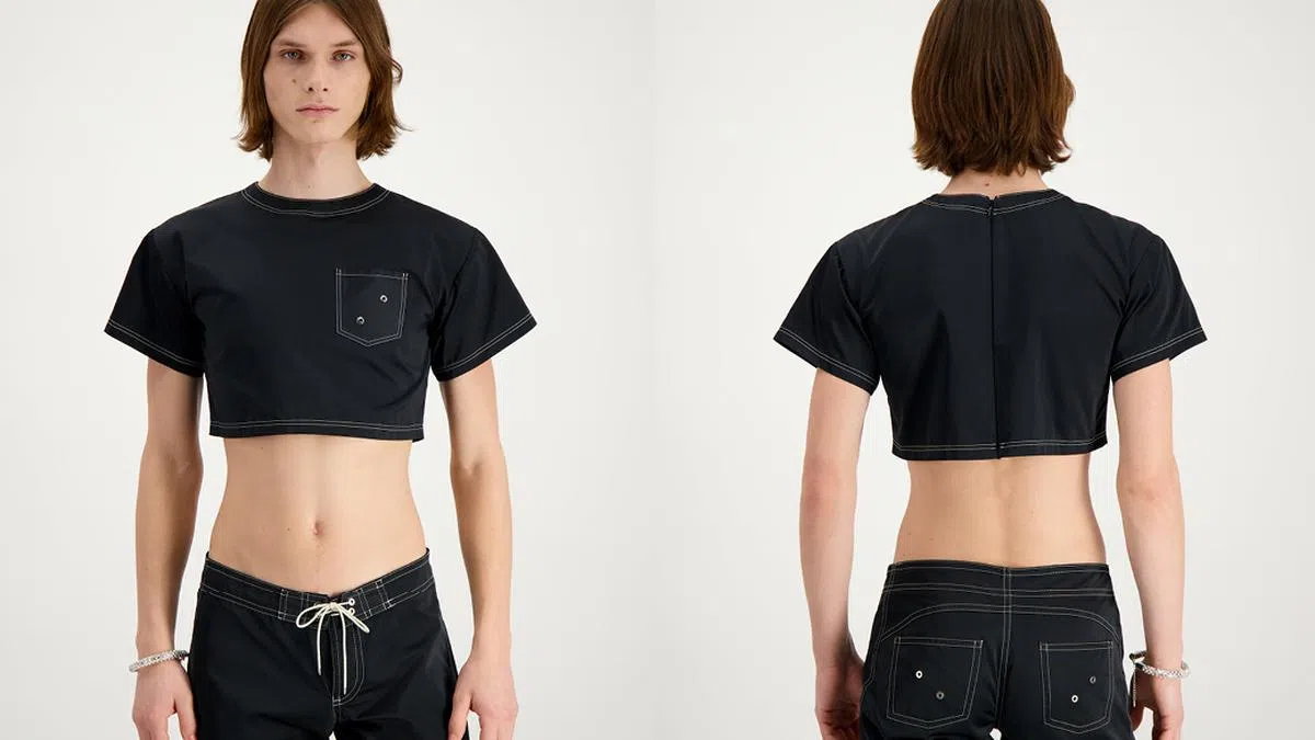 女性时尚卖弄性感已经不稀奇,但celebrate男生妖娆一面的时尚品牌,确是寥寥无几。简约的单品却有着大胆的剪裁,小编想要的,就是一件专为男生体型剪裁的短版上衣(如下图)。