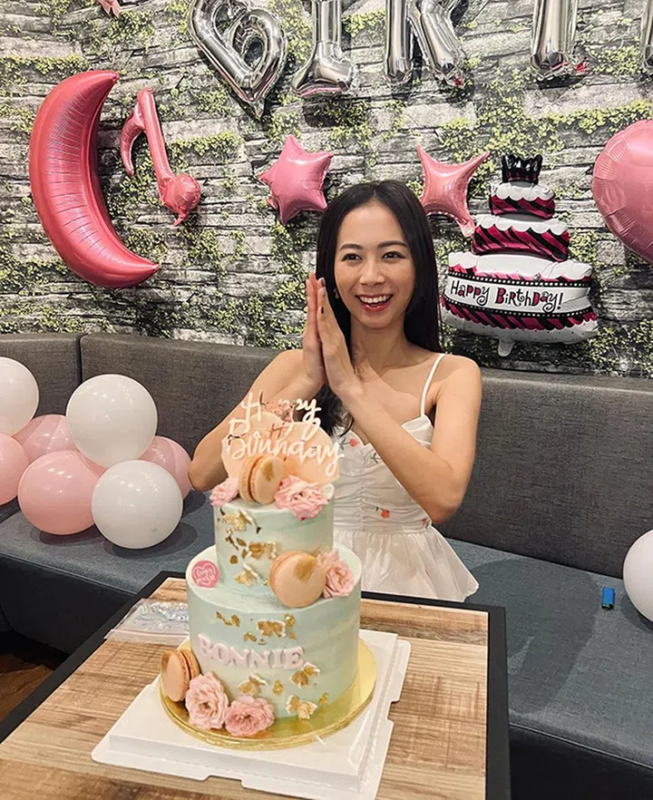 Bonnie收到的另一个双层定制蛋糕。她提早一天po出生日派对照片,没有特别华丽地打扮,而是穿着一件简单的花卉缀饰吊带白裙,给人一种小清新的少女感。