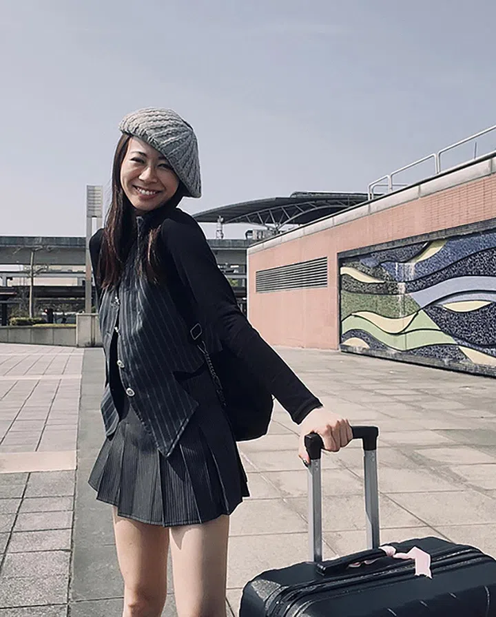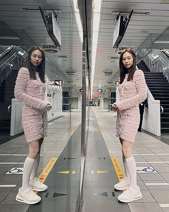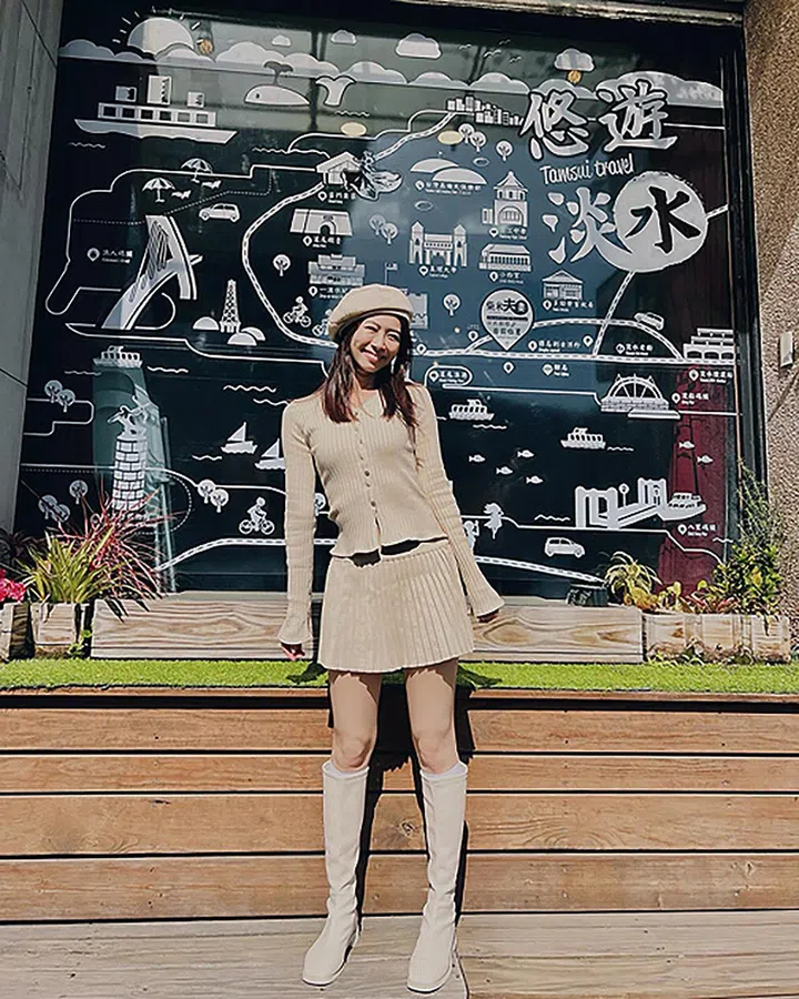 去台湾旅行时,Bonnie穿着针织/粗呢裙装,选择了粉嫩的色调。同时搭配及膝白袜和白球鞋,给人甜美的年轻氛围,散发出可爱魅力。