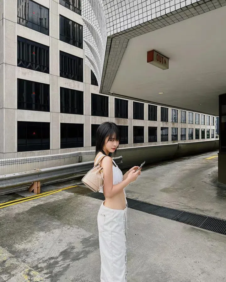 2023年Prada在本地ION开设快闪店,出售一系列度假风成衣及配饰。黄暄婷这身造型以时尚不退热度的胸衣搭配钩针斜挎袋,外形阳光又性感。