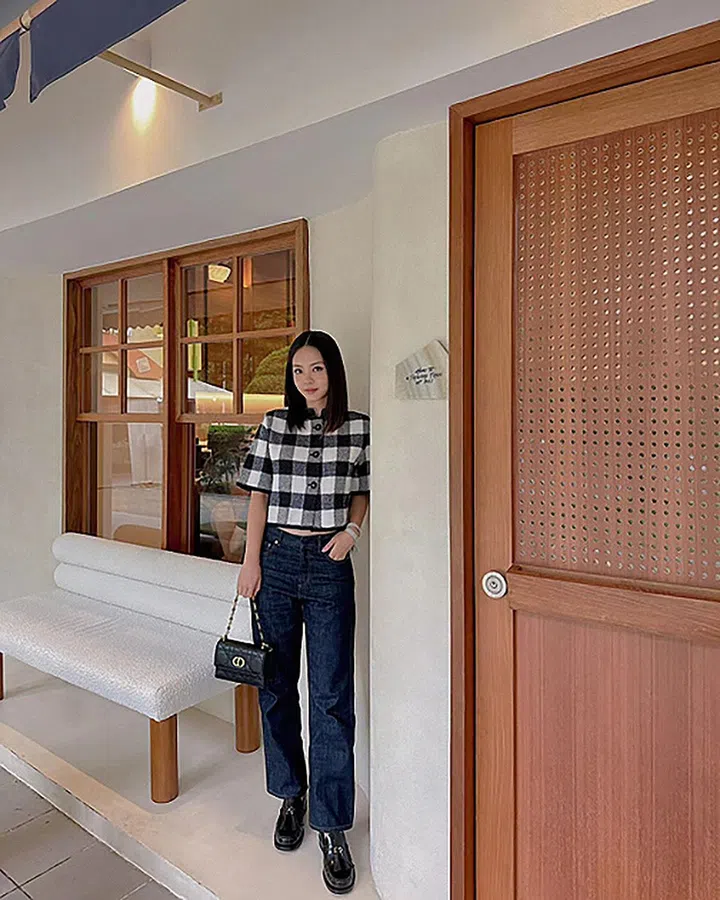 方形剪裁的短版黑白格上衣,搭配高腰牛仔裤及乐福鞋,展现优雅又休闲的日常时尚风格。手中袋款来自Dior今年秋季的Miss Caro迷你型羊皮链袋,手袋袋身装饰独特Macrocannage绗缝,以及灵感源自Dior香水瓶的金色CD金属转扣。