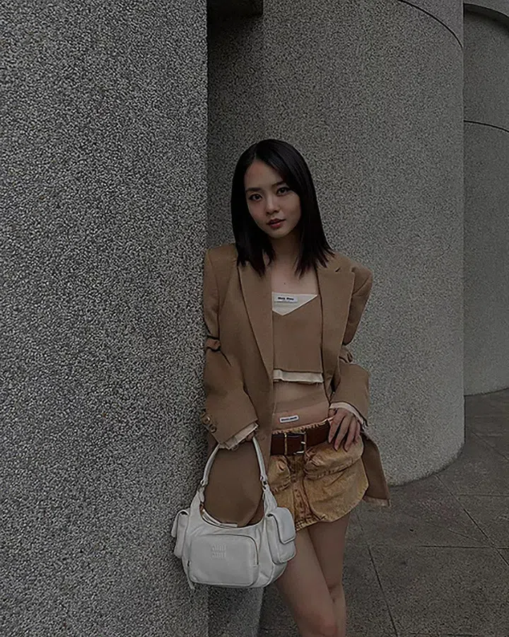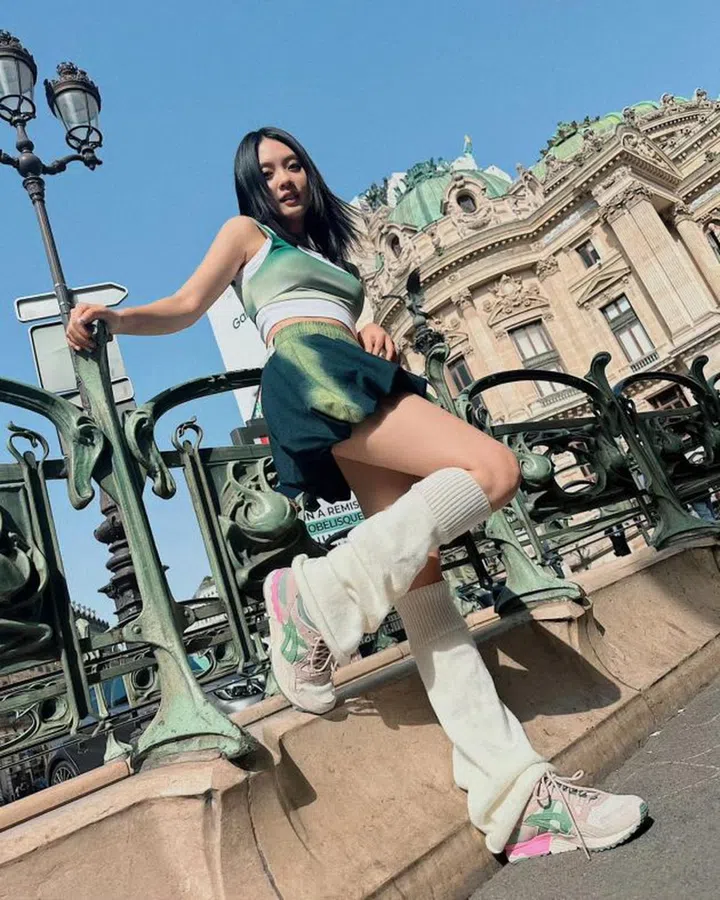 黄暄婷也多次用迷你裙两件套搭配袜套(穿球鞋或乐福鞋),风格复古又俏皮,还很有Jennie范哦。
