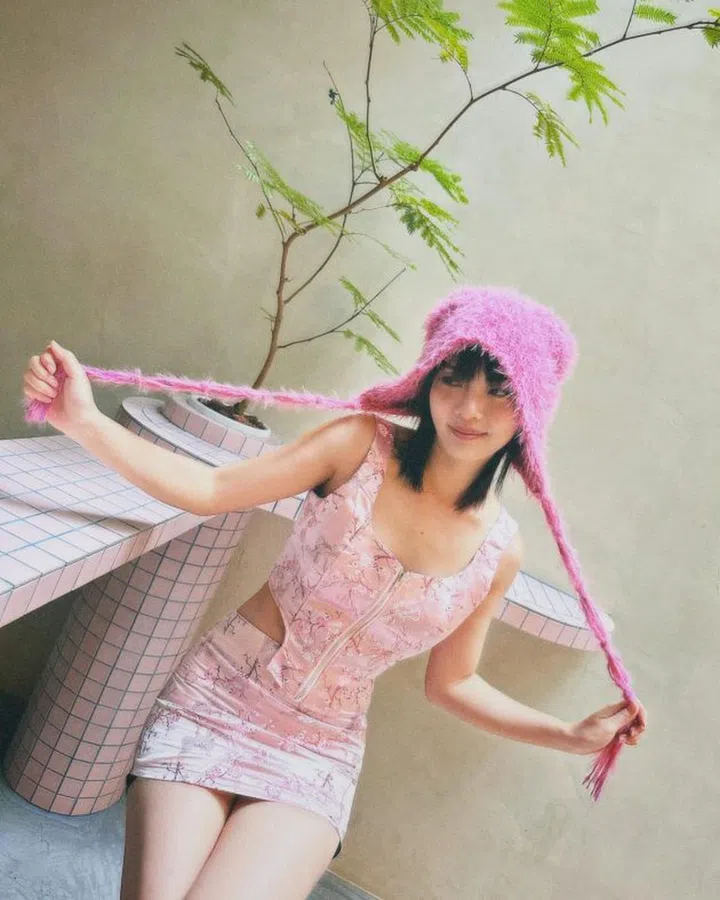 今年最可爱新春造型也“颁”给黄暄婷,她选穿粉色提花胸衣+迷你裙两件套套装(可从ASOS购买),搭配软萌的粉色帽饰,造型讨喜,相信出门回头率也超高哦。