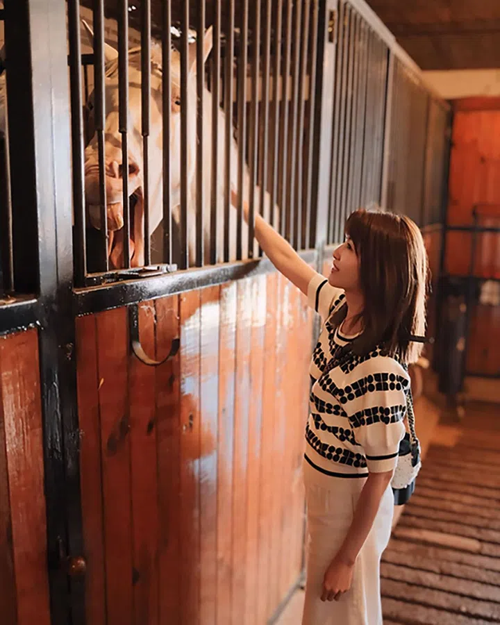欧萱在行程中和Lusitano Horse(葡萄牙纯种马)近距离接触,体验马场氛围。喜爱白色的她选择了一件黑色几何花纹的短袖针织衫+白裤,搭配黑白色肩袋,便于户外行动又不失优雅风采。