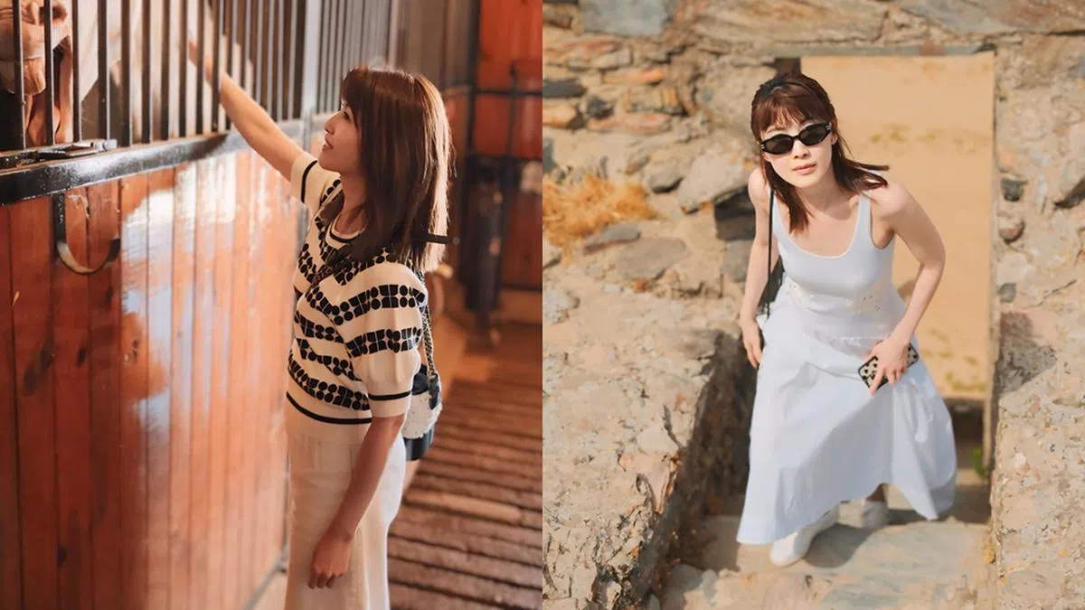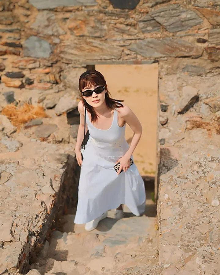 欧萱今年步入45岁,仍然拥有令人羡慕的年轻态外表和身材。同样,在穿着打扮方面,欧萱也是effortless chic的优雅代表。目前旅行中的她,这身白裙+白鞋+白包的清爽造型,在蓝天下给人无比自在和轻松的感受。