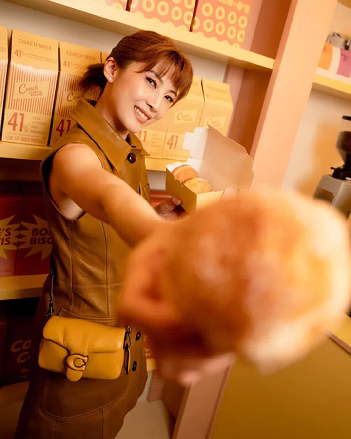 谁能不爱这张“男友视角”美照!欧萱穿着Coach皮革连衣裙搭配同色系Pillow Tabby斜挎袋在COACH PLAY限时概念店打卡,展现她私下活泼甜美的一面。