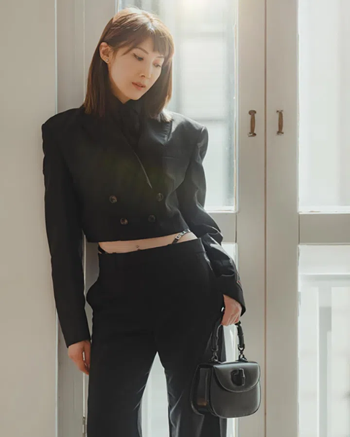 驾驭时尚露腰造型, 欧萱选穿短版西装套装,搭配Gucci Bamboo 1947手袋。造型全部采用黑色调,展现帅气之余也用腰部细节透露一丝小性感。