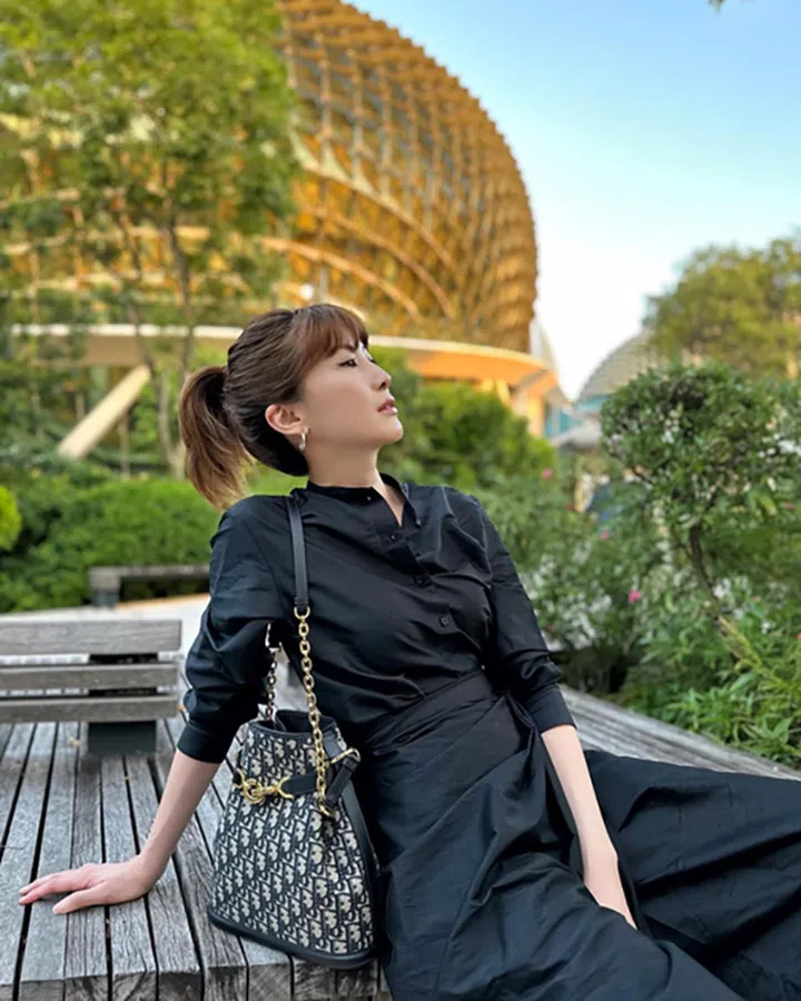 同样是黑色两件套,这身衬衣及裹式长裙来自Dior 2023年早秋系列,糅合当代简约风格和传统元素,既适合日常穿着,又能应对正式活动。欧萱搭配的包包,则是品牌的C'est Dior提花手袋(可肩背也可手拎)。