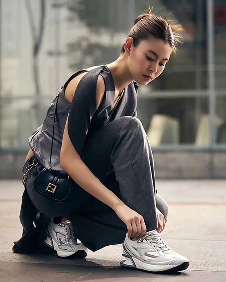 超有辨识度的Fendi套装,相对于搭配Fendi First高跟鞋,陈楚寰穿着带F鞋跟的Fendi First 1球鞋, 也展现出现代都市女性快节奏的生活方式。