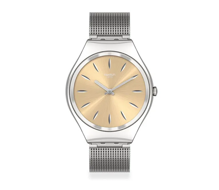 别忘了Swatch除了硅胶表带腕表,也有许多设计简约的米兰式织网表链款式。这款采用银金配色的Skingoldenblink腕表,佩戴起来帖服又轻盈,犹如第二层肌肤。