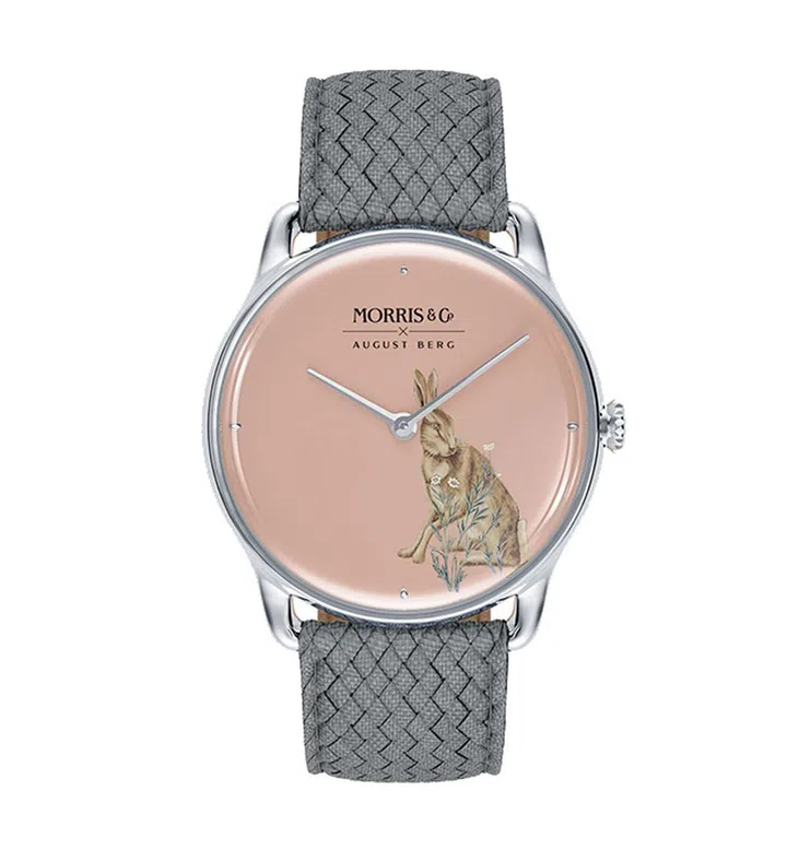 William Morris是19世纪英国极具影响力的艺术家及设计师(同时还是小说家和诗人),尤其以织品花纹及壁纸图样见长。这款Forest Hare腕表的设计,正是从1887年的一款壁毯图案撷取灵感。