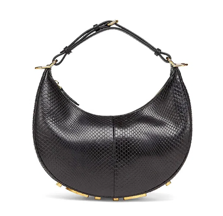 今季上镜率超高的Fendigraphy手袋,采用圆润的“半月”轮廓,包底装饰醒目“FENDI”金属标志。该款式拥有可调节肩带,便于手拎及肩背,同时也可添加肩带斜挎。