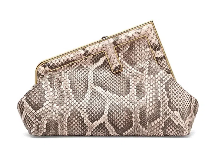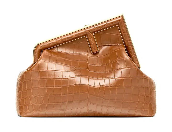 品牌也推出鳄鱼皮材质(在常见的鳄鱼、鸵鸟、蟒蛇、蜥蜴四大珍稀皮革中,鳄鱼皮最为稀少且珍贵)Fendi First手袋,内里也以柔软羊皮打造,彰显极致奢华质感。