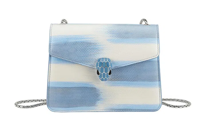 该手袋以蓝宝石渐变色调水蛇皮打造袋身,内里采用羊皮,手袋上的镀钯黄铜蛇首搭扣也以蓝色调饰以哑光和亮面尼亚加拉蓝宝石蓝色珐琅鳞片,点缀黑色缟玛瑙双眼。