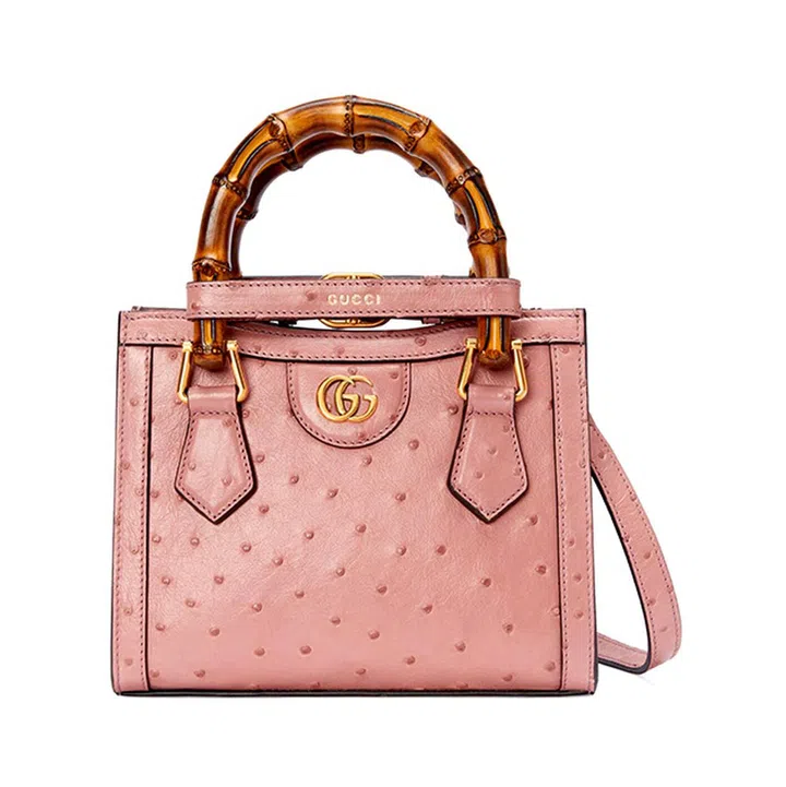 这款迷你竹节手提包/肩带,融合了品牌的经典竹节提手元素及和双G配件两个具有辨识度的品牌标记。粉色的鸵鸟皮材质不仅应用在袋身,也在竹节手柄上出现,巧妙呼应,相映成趣。
