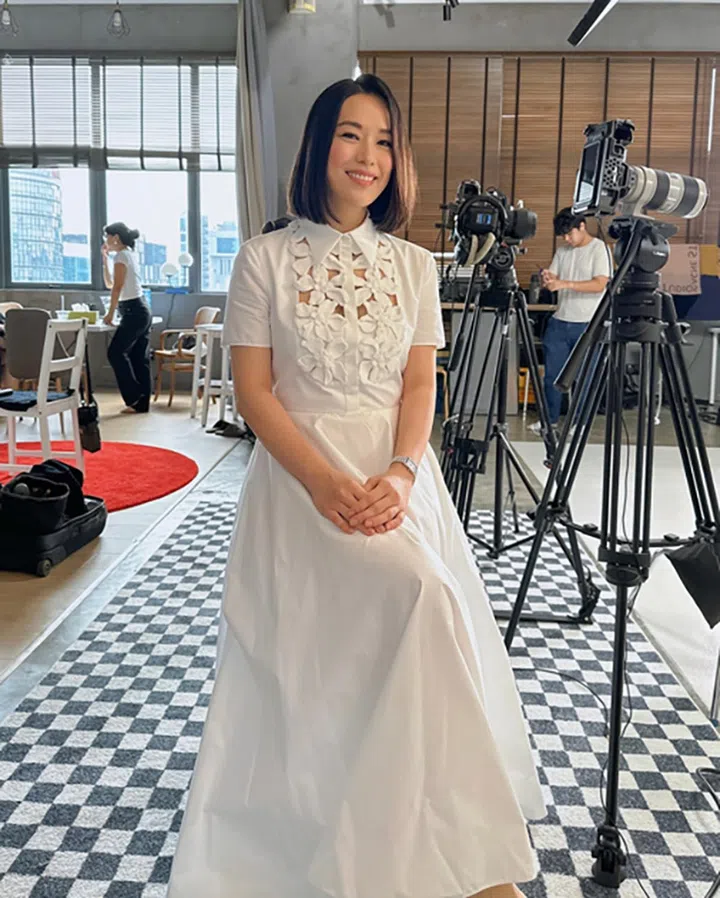 对白色颇为偏爱的林慧林,产后穿上Valentino的白色立体堆花工艺迷笛连衣裙恢复工作(孕前也穿过一款Alexander McQueen白色印花衬衣长裙),造型端庄又大方。