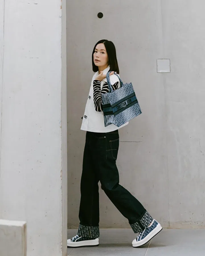 私下常常背Dior Book tote出门的林慧玲,相信也是看中了这款手袋经典、休闲又“好装”的优点。上图这款装饰蓝色denim Dior Oblique提花的Book tote,袋身采用不规则石洗效果,风格松弛又随性。同时,手袋也和她裤脚及Walk'n'Dior球鞋上的Dior Oblique图案相呼应——这种时装+手袋/时装+鞋履/手袋+鞋履的“同款”穿搭方式,今年特别流行。