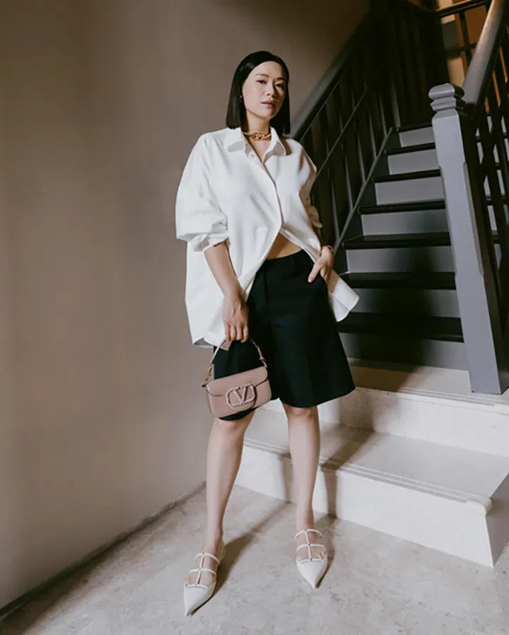 近日,林慧玲也在IG展示Valentino造型及品牌各式各样的Locò手袋,黑白穿搭简约、现代,还自信“炫腹”——看来她产后真的恢复得很不错哦!她脚下的这款白色尖头Rockstud Wispy平底穆勒鞋,则为整体中性风造型注入了一丝精致女性美。