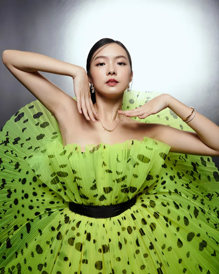 林詠谊今年入围“最受欢迎潜力星”,以H&M早前一款青绿色印花薄纱裙出席“红星大奖”,搭配Tiffany & Co.珠宝,展现出一股明媚的年轻活力。