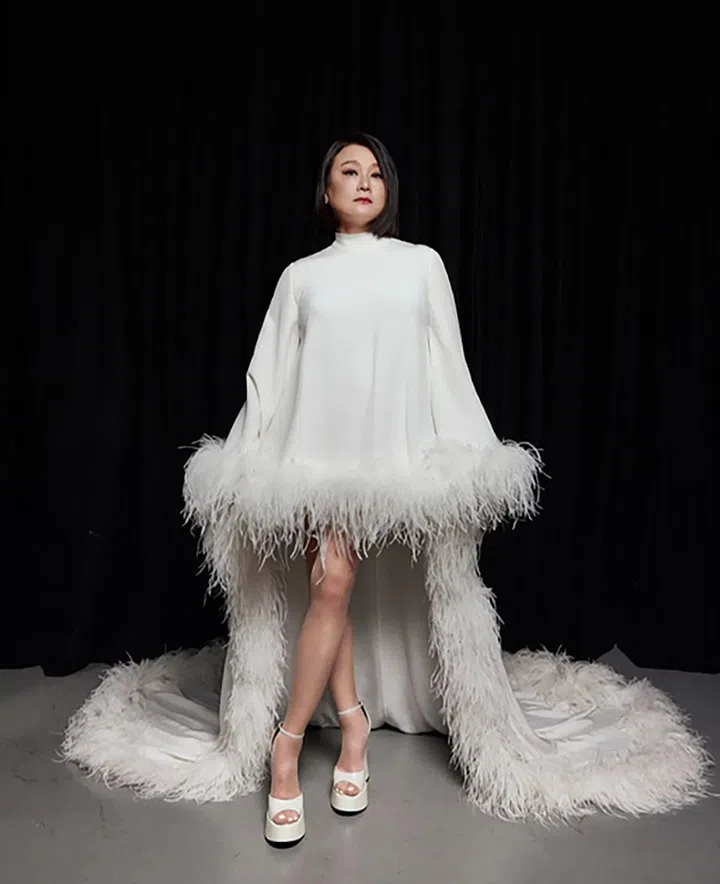 今年红星大奖不少女星选穿黑白造型,但在经典黑白的基础上,要穿出特色和亮点不容易。陈莉萍穿着造型师Melvin为其挑选的白色Ivan Young羽饰礼服,搭配Tiffany & Co.珠宝,造型高贵又有时尚看点。