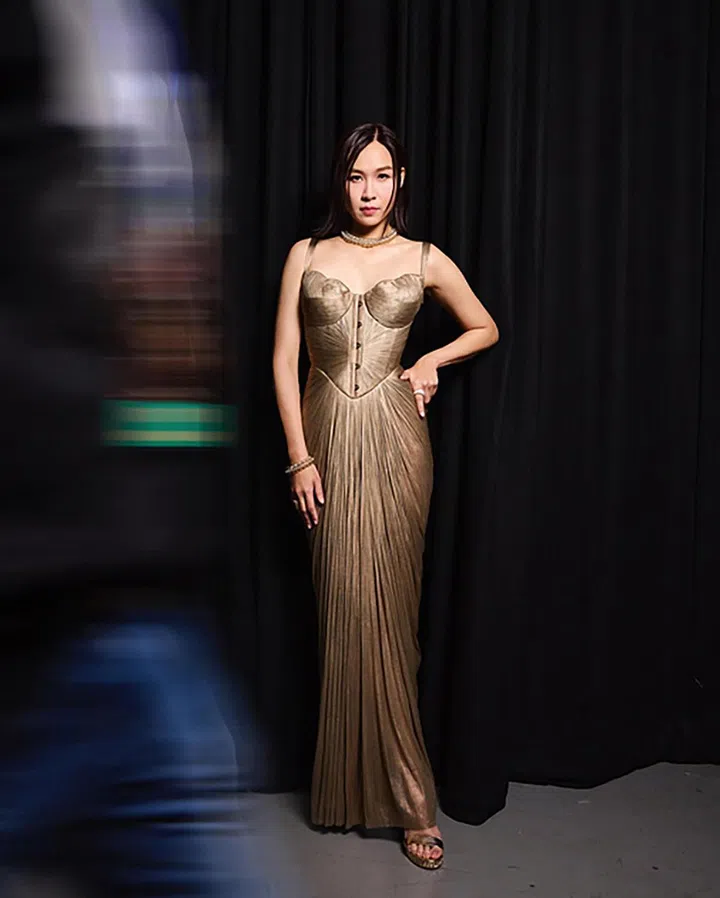 同样是“10大最受欢迎女艺人”之一的雅慧,造型师Melvin为她挑选了一袭来自Maria Lucia Hohan的金色礼服,搭配Tiffany & Co.,身形优美流畅,散发强大女神气场。