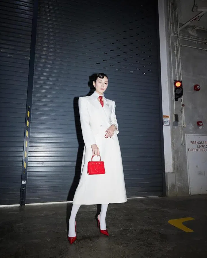 把白衣造型穿得最英气的一位,当属以Dolce & Gabbana白色长大衣亮相的洪丽婷,造型中穿插的红领带、红手袋及红色高跟鞋,也为造型大大增色。