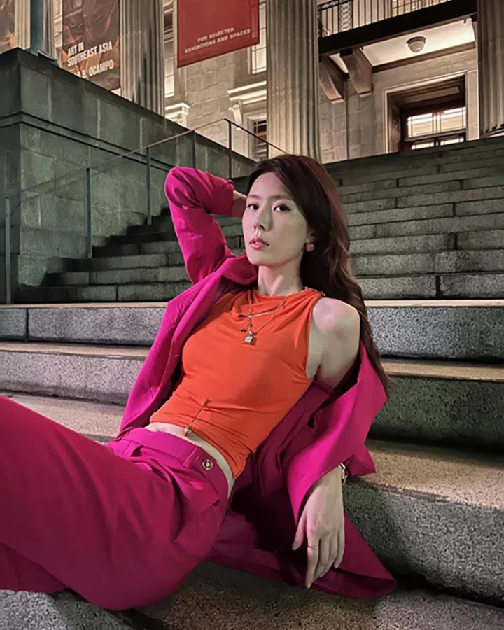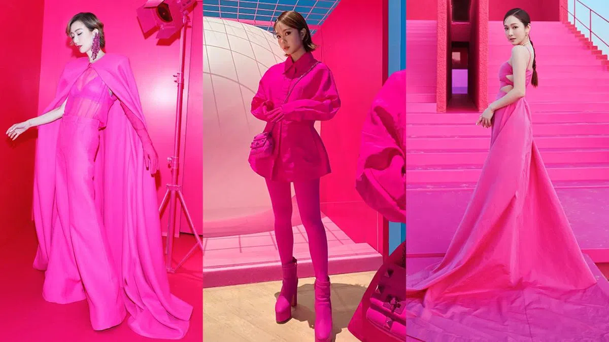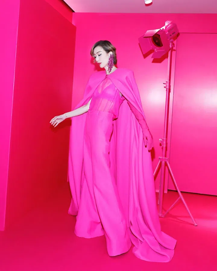 再比如黄思恬身上这套造型,来自Versace今年春夏系列。Versace采用玫粉及橙色进行撞色组合,超难驾驭的两大“难色”,黄思恬也成功hold住。