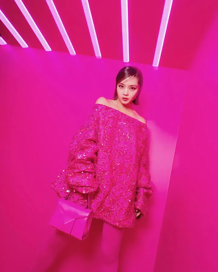 这身浪漫唯美的Fancì荷叶边连衣裙(Garden of Eden Dress)早前Rosé在《Pink Venom》MV中出场时也有穿着黑色款式,Rosé穿得暗黑唯美,而Davika则以玫粉色展现妩媚气质。