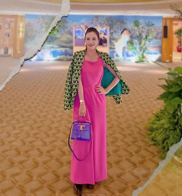 郑惠玉敢于大胆玩色,其造型也常常不打安全牌,让人眼前一亮。这身出席婚礼的造型,她以玫红色长裙搭配紫色手袋,绿色调外套也点缀粉色元素,造型看头多多又不杂乱。