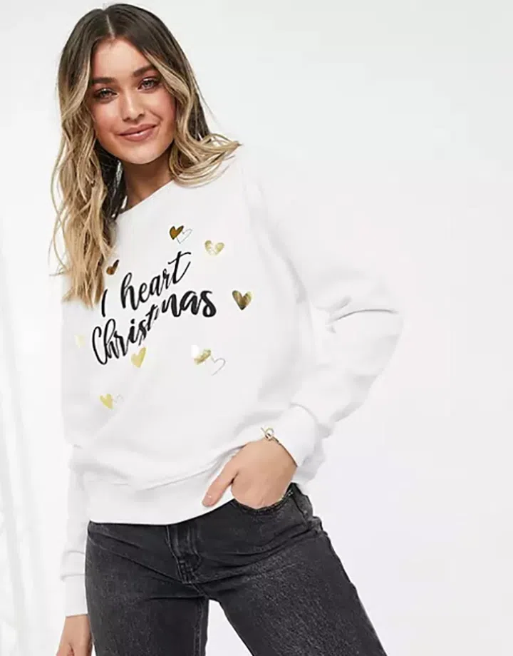 推荐给“偶像包袱”比较重的女友们,简约的白色运动衫印上 "I heart Christmas" 与精致的金色小爱心,简简单单的呼应圣诞气氛。