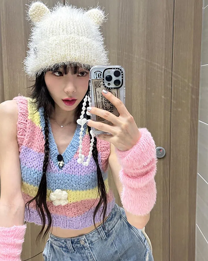针织单品正流行,你跟上这股潮流了吗?泰妍的这件棉花糖色上衣还配有一朵针织小花,很是绚丽可爱~ 再配上毛茸茸的帽子+袖子,泰妍实在太有少女感了!